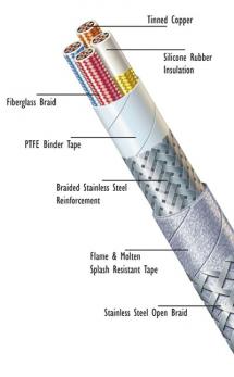 Extruded silicone rubber with fiberglass braid cover over each insulated conductor. K-2 color code. (Unless specified)