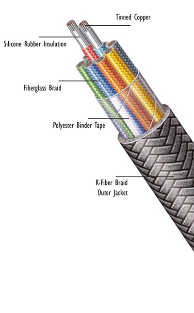 Extruded silicone rubber with fiberglass braid cover over each insulated conductor. Braid treated with a moisture, heat and flame resistant finish for K-2 color coding (Unless specified) and abrasion resistance.