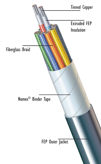 Multiple conductor cables insulated and jacket with FEP Teflon® are widely used in industrial high temperature applications where resistance to abrasion and mechanical abuse coupled with moisture or fluid resistance are desired. This wire is widely used in steel and glass plants, as well as high temperature locations near boilers, steam lines and in chemical processing plants. Use above or below grade in raceway, tray, or conduit.