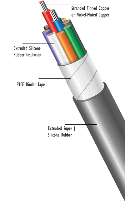 SRS-Super J multi-conductor cables are designed for use in high temperature applications as a multiple conductor power and control cable where flexibility and resistance to heat and flame are desired. This cable can be used in robotic applications, as well as a variety of industrial applications in steel and glass plants and power generating stations.